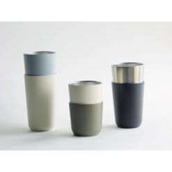 De deksel is voorzien van een draaibare dop. De dubbelwandige roestvrijstalen beker voorkomt warmteoverdracht door een vacuüm tussen de binnen- en buitenwand. Met deze tumbler kun je dranken tot 1 uur lang boven de 65°C of juist onder de 10°C houden. Past in espressomachines, koffiezetapparaten en bekerhouders van auto’s. De bekers kunnen worden gestapeld en meegenomen voor gebruik buitenshuis. Met afneembare siliconen ring, dus eenvoudig schoon te maken.
